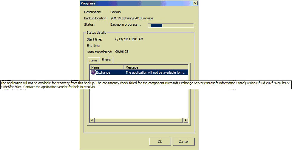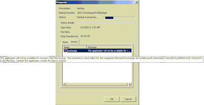 This application will not be available for recovery from this backup. This consistency check failed for the component Microsoft Exchange Server\Microsoft Information Store\EX4\cc08f60d-e02f-47a0-b972e165fb50ec, Contact the application vendor for help in resolving.