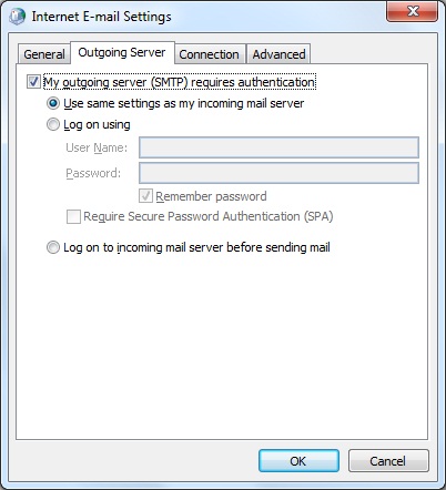 In outlook select the “Use same settings as my incoming mail server” under “My outgoing server (SMTP) requires authentication”