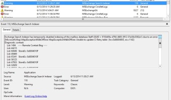 Issue When you perform a mail search, it only displays recent mails. Application Event ID: 118 - MSExchange Search IndexerExchange Search Indexer has temporarily disabled indexing of the mailbox database Staff (GUID = 9150d5fa-d794-4685-8f12-01e58c0382a1) due to an error … [Read more...] about Rebuild Exchange Server 2010 Search Indexer