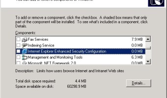 To disable Internet Explorer Enhanced Security Configuration open Add or remove windows component from Server 2003 control panel and remove "Internet Explorer Enhanced Security Configuration" feature. … [Read more...] about Disable IE Enhanced Security Configuration on Server 2003